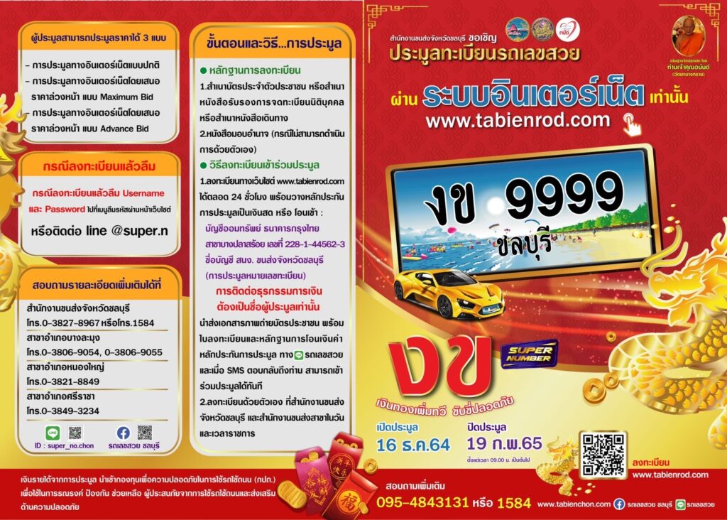 ขนส่งจังหวัดชลบุรี ขอเชิญร่วมประมูลทะเบียนรถเลขสวย