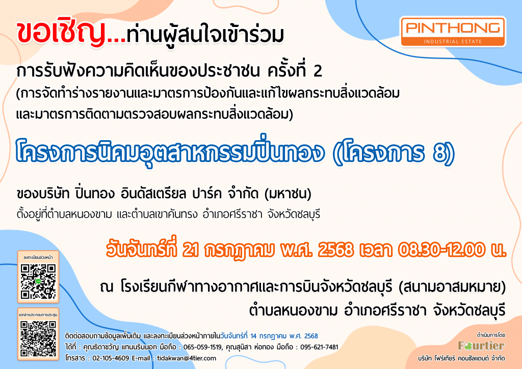 การจัดทำร่างรายงานและมาตรการป้องกันและแก้ไขผลกระทบสิ่งแวดล้อม และมาตรการติดตามตรวจสอบผลกระทบสิ่งแวดล้อม โครงการนิคมอุตสาหกรรมปิ่นทอง (โครงการ 8) ของบริษัท ปิ่นทอง อินดัสเตรียล ปาร์ค จำกัด (มหาชน) ตั้งอยู่ที่ตำบลหนองขาม และตำบลเขาคันทรง อำเภอศรีราชา จังหวัดชลบุรี วันจันทร์ที่ 21 กรกฎาคม พ.ศ.2568 เวลา 08.30-12.00 น. ณ โรงเรียนกีฬาทางอากาศและการบินจังหวัดชลบุรี (สนามอาสมหมาย) ตำบลหนองขาม อำเภอศรีราชา จังหวัดชลบุรี