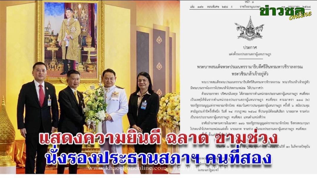 ต่อมาในคราวประชุมสภาผู้แทนราษฎร ครั้งที่ 6 สมัยประชุมสามัญประจำปีครั้งที่หนึ่ง วันที่ 24 ก.ค.2568 ที่ประชุมได้ลงมติเลือก นายฉลาด ขามช่วง เป็นรองประธานสภาผู้แทนราษฎร คนที่สอง แทนตำแหน่งที่ว่าง อาศัยอำนาจตามความในมาตรา 116 ของรัฐธรรมนูญแห่งราชอาณาจักรไทย จึงทรงพระกรุณาโปรดเกล้าโปรดกระหม่อมแต่งตั้ง นายฉลาด ชามช่วง เป็นรองประธานสภาผู้แทนราษฎร คนที่สอง ทั้งนี้ ตั้งแต่บัดนี้เป็นต้นไป ประกาศ ณ วันที่ 28 ก.ค.2568 เป็นปีที่ 10 ในรัชกาลปัจจุบัน ผู้รับสนองพระบรมราชโองการ ภูมิธรรม เวชยชัย รองนายกรัฐมนตรี