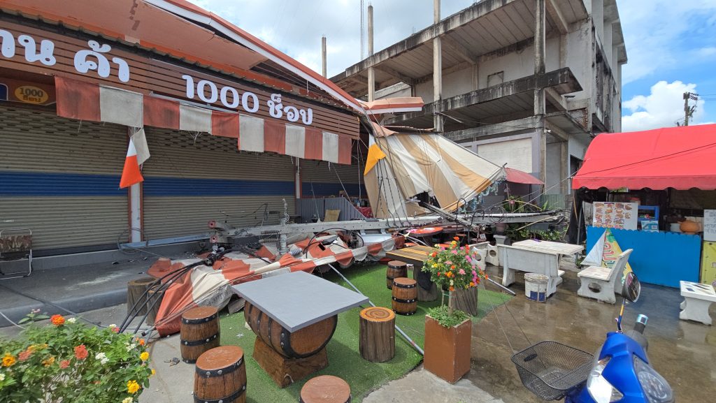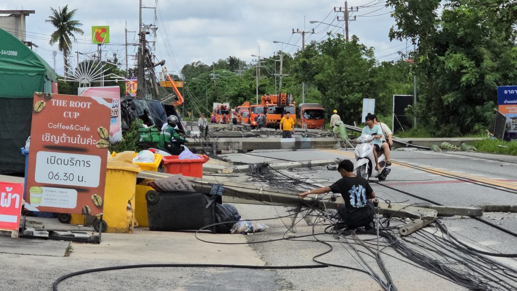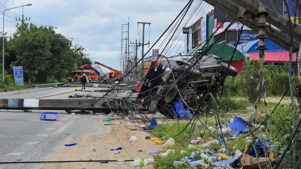 ในที่เกิดเหตุพบเสาไฟฟ้าหลายสิบต้นล้มขวางถนนเป็นระยะทางประมาณ 500 เมตร รถทุกชนิดไม่สามารถสัญจรผ่านไปมาได้ โดยพบรถยนต์กระบะมาสด้า ผฉ 2103 กรุงเทพมหานคร พุ่งชนติดคาโคนเสาไฟฟ้าอยู่ ในสภาพตะแคงข้าง รถลอยอยู่เหนือพื้น 2 ล้อ โดยคนขับรถทราบชื่อคือ นายสิทธิพงษ์ นาคูณ อายุ 41 ปี เป็นพนักงานโรงงานแห่งหนึ่ง ได้รับบาดเจ็บไม่มาก เจ้าหน้าที่กู้ภัยนำตัวส่งโรงพยาบาล จากการตรวจสอบพบว่ามีเสาไฟฟ้าแรงสูงล้ม 6 ต้น เสาไฟฟ้าขนาดความสูง 12 เมตร ล้ม 6 ต้น มีรถยนต์ตู้โดยสารและรถกระบะได้รับความเสียหายหลายคัน รวมทั้งบ้านเรือนประชาชนและร้านค้าได้รับความเสียหายจากเสาไฟฟ้าอีกหลายหลัง ส่งผลให้ไฟฟ้าในบริเวณดังกล่าวไม่สามารถใช้การได้ รวมทั้งต้องปิดการสัญจรถนนเส้นดังกล่าวเพื่อเคลียร์สถานการณ์อีกตลอดทั้งวัน และอาจจะต้องแก้ไขไปจนถึงวันพรุ่งนี้เลยทีเดียว