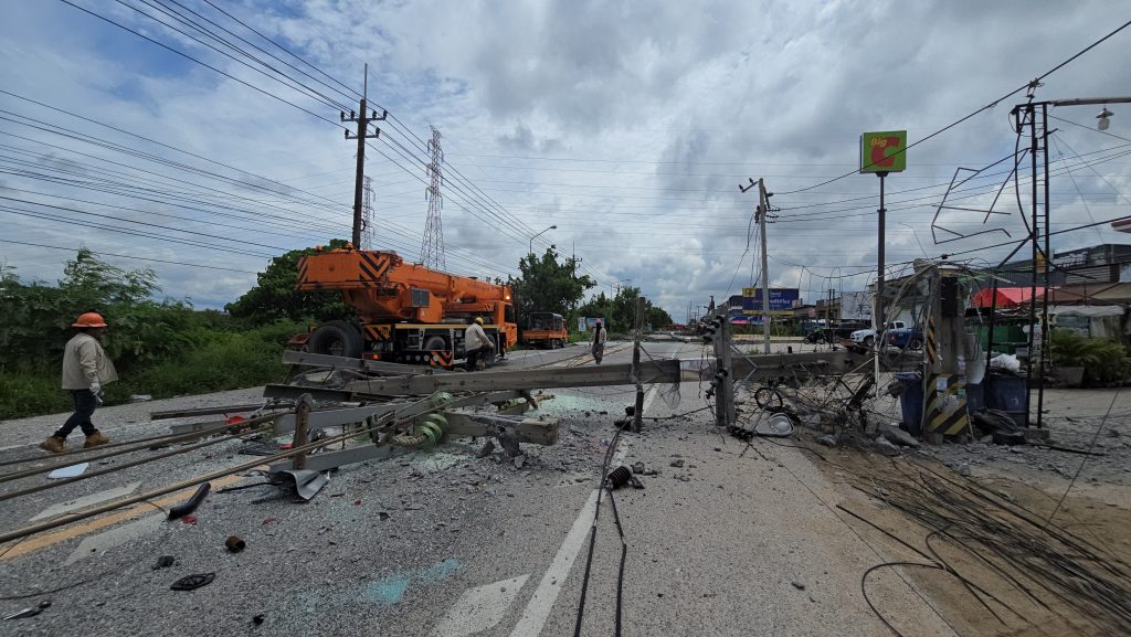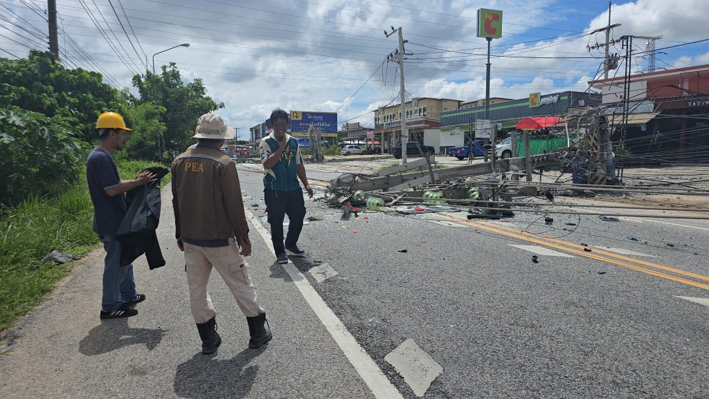 กระบะชนเสาไฟฟ้าล้มขวางถนน 12 ต้น ไฟดับ ปิดการจราจรทั้งวัน