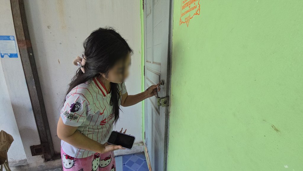 ตนเองเห็นว่าทำไมประตูเปิดออกเอง จึงเดินกลับไปที่ประตูเพื่อที่จะปิดและล็อกประตูให้สนิท ขณะกำลังก้มลงเขี่ยรองเท้าอยู่นั้น พอเงยหน้าขึ้นไปก็เห็นประตูเปิดออก ตนเองมองก็เห็นสายตาคนร้ายมองจ้องตนเองอยู่พอดี ตนเองจึงตกใจร้องกรี๊ดออกมาดังลั่น ทำให้แฟนหนุ่มตกใจหยิบค้อนไว้ในมือ หากคนร้านเข้ามาก็จะได้ใช้ป้องกันตัวได้ ส่วนคนร้ายคงตกใจเหมือนกัน จึงค่อย ๆ เดินออกไปจากบ้านแล้วขี่รถจักรยานยนต์หลบหนีไปอย่างลอยนวล จึงออกมาโพสต์แจ้งเตือนภัยให้คนอื่นได้ระมัดระวังตัวเองด้วย ถ้าหากต้องกลับบ้านดึก ๆ คนเดียว ควรจะหาเพื่อนกลับมาด้วย เวลาขี่จักรยานยนต์ก็พยายามระมัดระวัง มองกระจกหลัง สังเกตสิ่งผิดปกติ แต่ถ้าหากมีครอบครัวก็ขอให้คนในครอบครัวขี่มารับมาส่งก็จะดีมี่สุด