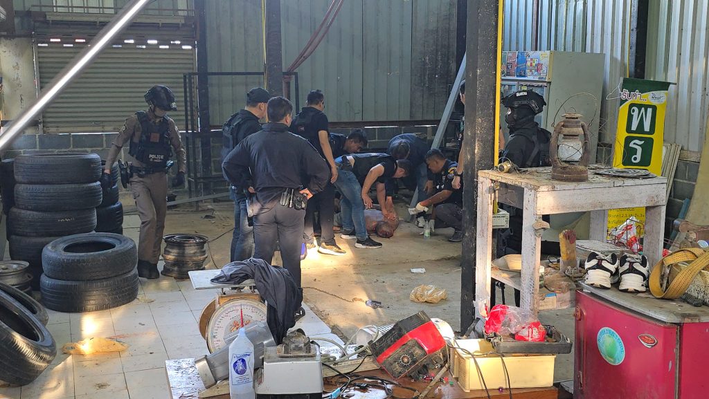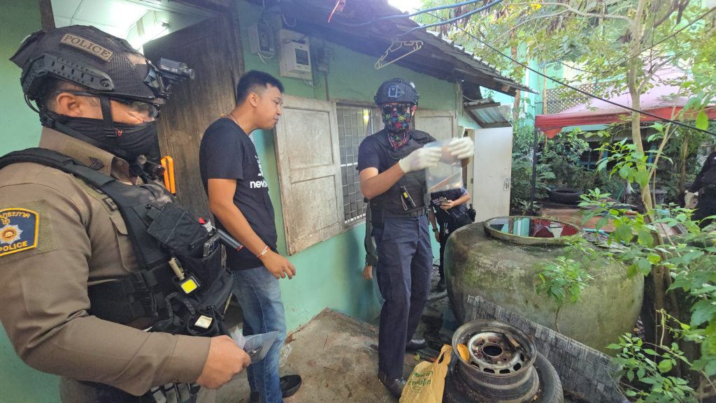 โดย เจ้าหน้าที่ตำรวจชุดสืบสวน สภ.ศรีราชา นำกำลังเจ้าหน้าที่เกือบ 20 นาย มาปิดล้อมตั้งแต่ช่วงเช้ามืด และแสดงหมายค้นเตรียมเข้าไปในบ้าน ทำให้นายไอซ์ที่ระมัดระวังตัวอยู่แล้ว จึงล็อคห้องนอนแล้วโยนสิ่งของลักษณะคล้ายอาวุธปืนออกมาจากหน้าต่างห้องออกมาด้านนอก ก่อนถือมีดคัตเตอร์วิ่งหนีออกไปจากห้องนอน เจ้าหน้าที่ตำรวจได้เข้าตรวจสอบสิ่งของที่ถูกนายอซ์โยนออกมาจากห้องพบว่าเป็นอาวุธปืนบีบีกัน แบบแม็กกาซีนสีดำ