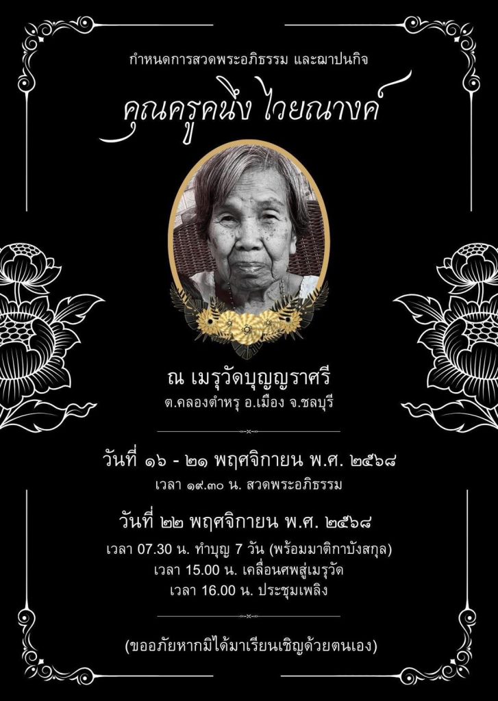เมื่อที่ 16 พฤศจิกายน พ.ศ. 2568 ที่วัดบุญญราศรี ต.คลองตำหรุ อำเภอเมือง จังหวัดชลบุรี ได้มีพิธีรดน้ำศพและสวดพระอภิธรรม คุณครูคณึง ไวยณางค์ มารดาของ หมวดมอส ชัยนาม ไวยณางค์ แห่งชมรมฟุตบอล VIP หนองปรือ ท่ามกลางความโศกเศร้าอาลัยของครอบครัว ญาติสนิท และมิตรสหาย