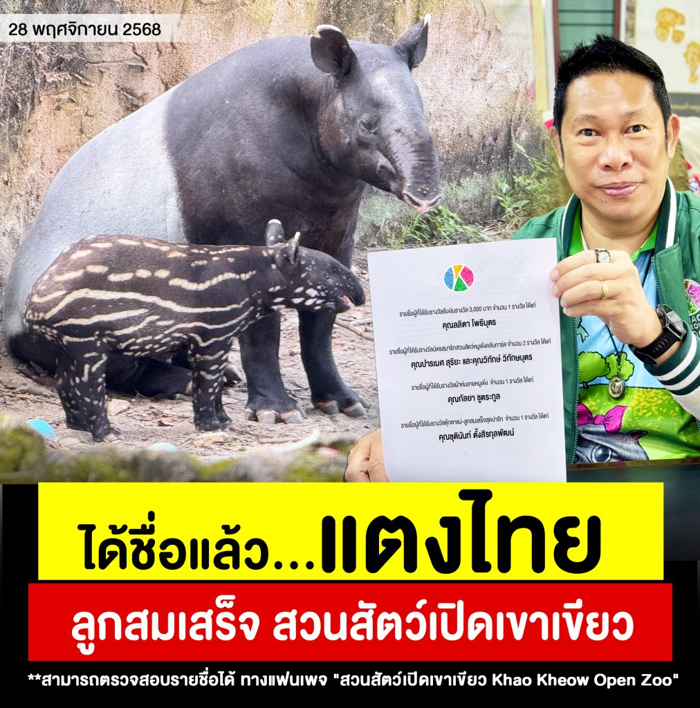 วันนี้ (28 พฤศจิกายน 2568) นายณรงวิทย์ ชดช้อย ผู้อำนวยการสวนสัตว์เปิดเขาเขียว อ.ศรีราชา จ.ชลบุรี เปิดเผยว่า “ลูกสมเสร็จ” ตัวล่าสุดที่เกิดเมื่อวันที่ 28 กันยายน 2568 ที่ผ่านมา ได้รับการตั้งชื่อเรียบร้อยแล้ว คือ “แตงไทย” ซึ่งเป็นชื่อที่ได้รับคะแนนโหวตสูงสุดจากกิจกรรมโหวตชื่อผ่านแฟนเพจ Facebook ของสวนสัตว์้เปิดเขาเขียว