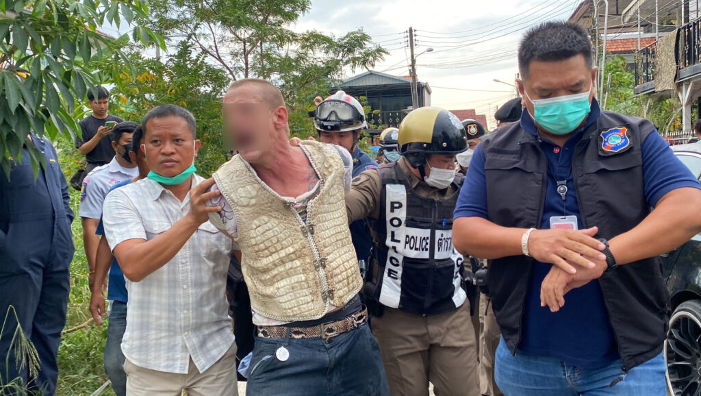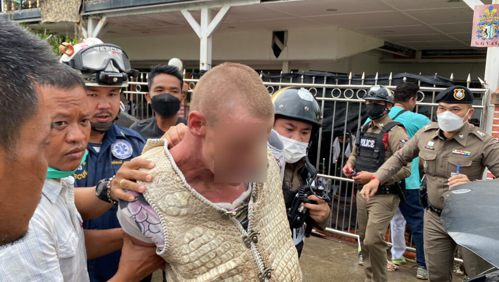 เมื่อเวลา 16.30 น. วันที่ 7 พ.ย. พ.ต.อ.นาวิน สินธุรัตน์ ผกก.สภ.บางละมุง จ.ชลบุรี ได้รับการประสานขอกำลังเสริม จากตำรวจตรวจคนเข้าเมืองชลบุรี ว่ามีชาวต่างชาติหนีหมายจับมีอาการคลุ้มคลั่งอาละวาดไม่ยอมให้จับกุม เหตุเกิดที่บ้านเลขที่ 56/6 ม.8 ต.หนองปลาไหล อ.บางละมุง จ.ชลบุรี หลังรับแจ้งจึงนำกำลังสายตรวจ ชุดสืบสวน หน่วยกู้ภัยมูลนิธิสว่างบริบูรณ์พัทยา รถดับเพลิง เดินทางไปสมทบ